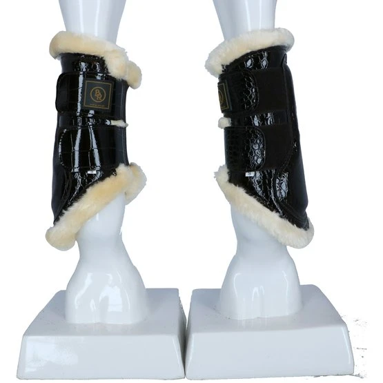 Stilvolle Gamaschen aus Kunstlackleder mit Krokodruck und weichem Futter aus synthetischem Lammfell. Dieses schaffreundliche Fell ist sehr weich, leicht, atmungsaktiv und besonders pflegeleicht. Das Futter sorgt für eine optimale Druckverteilung und hilft bei der Vorbeugung von Druckstellen. Ideal für Pferde mit empfindlicher Haut. Der Aufprallzone der Gamaschen ist mit einer Schicht aus stoßdämpfendem Neopren versehen, was zusätzlichen Schutz bietet. Die Gamaschen haben drei robuste Klettverschlüsse mit Elastikeinsatz. Aufgrund der flexiblen Form und der verstellbaren Klettverschlüsse können die Gamaschen perfekt an das Bein angepasst werden. Geeignet für die Vorder- und Hinterbeine. Paarweise verpackt. Maschinenwaschbar.