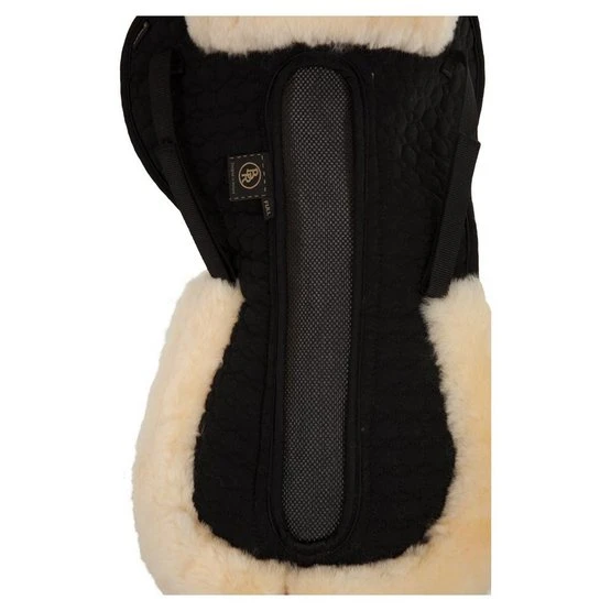 Baumwoll-Sattelunterlage mit Rand aus medizinisch gegerbtem Lammfell. Die Unterlage hat eine Aussparung für den Wirbelkanal aus Air Mesh. Dank dieser Air Mesh-Aussparung wird die Luftzirkulation verbessert und der Wirbelkanal bleibt kühler.