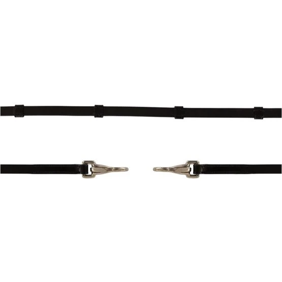 Dieser Lederzaum besteht aus hochwertigem Leder, das robust ist und lange schön bleibt. Der Zügel ist in der Mitte geschlossen und hat eine Stärke von ca. 13 mm (4/8“). Der Zügel hat auf beiden Seiten nicht weniger als vier Anschläge. Mit den starken Karabinerhaken an den Enden können Sie die Zügel einfach am Gebiss befestigen.