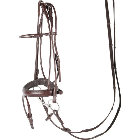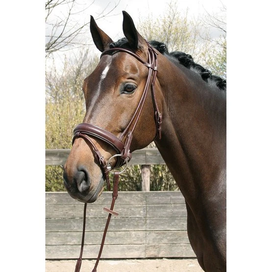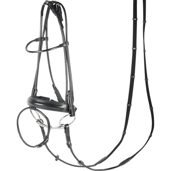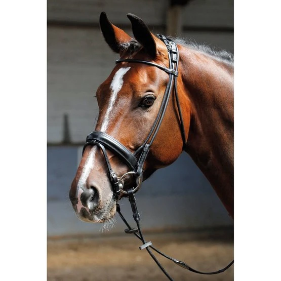 Luxuriöse rundgenähte Trense aus hochwertigem amerikanischen Leder. Mit Einschnürnasenriemen (4cm) mit weichem Polster, Edelstahlschnallen und Blindverschlüssen an den Backenstücken. Mit Zügeln mit Stegen.