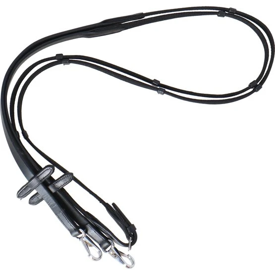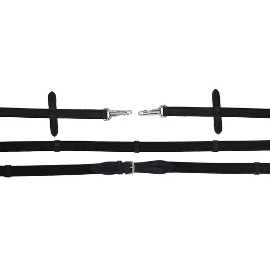 Zügel, Gurtband mit Lederstegen und Nickelschnallen. Mit (Saumur-)Blindverschlüssen.