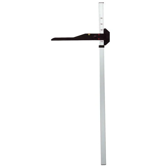 Beweglicher Arm mit Wasserwaage, damit der Messstab perfekt aufrecht steht. Maße in Zoll und in cm.