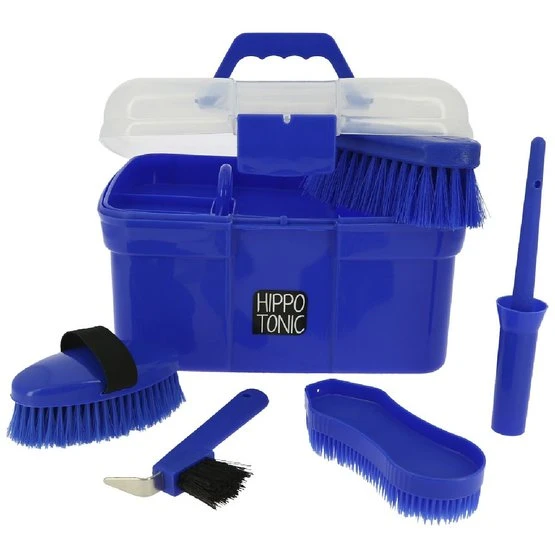 Kleine Polypropylenbox mit transparentem Deckel. Inhalt: – 1 separate Einsatzbox – 1 Hufkratzer – 1 Hufbürste mit Kappe – 1 Multifunktionsbürste – 1 harte Bürste – 1 weiche Bürste. Aus Polypropylen.