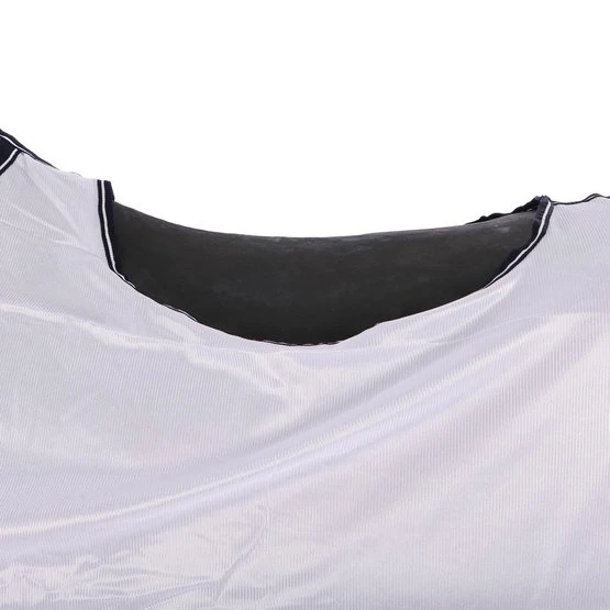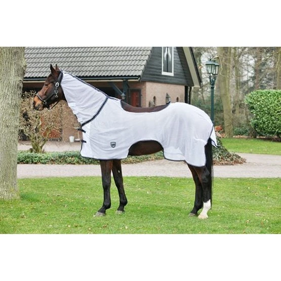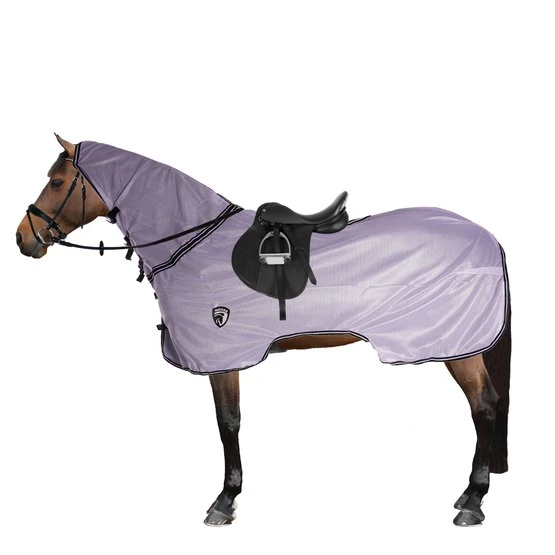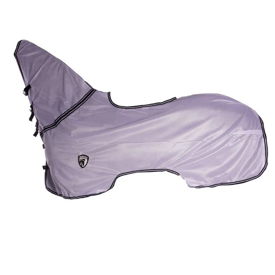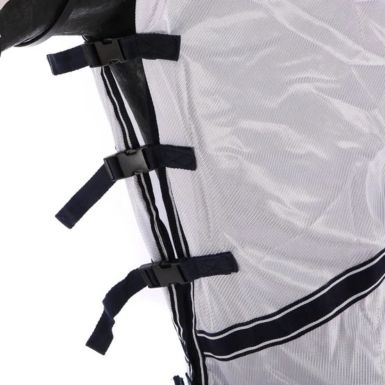 Die Horka Fliegendecke mit festem Halsteil und Sattelaussparung eignet sich besonders gut zum Reiten. Die Decke besteht aus einem feinen Netzgewebe (100% Polyester), das Fliegen und andere Insekten abhält. Der Brust-, Schweiflatz und der Nackenbereich sind mit Nylon gegen Abriebstellen versehen. Die Decke hat ein festes Halsteil, welches an der Trense befestigt werden kann. Das Halsteil kann mit drei Klettverschlüssen geschlossen werden. Außerdem hat die Decke eine große Sattelaussparung und eine Aussparung unter dem Bauch für die Beine des Reiters.