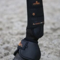 Die Sprungglocken Air Tech sind nicht nur sehr robust, flexibel und komfortabel, sondern haben aucheine sehr gute Passform. Durch den Anti-Rutsch-Ball an der Innenseite wird ein Drehen verhindert. Ein Gel in der Hufglocke absorbiert hervorragend Stöße und Schläge. Das äußere Material besteht aus perforierten Kunstleder, dadurch ist der Look mit den Geländegamaschen Air Tech perfekt. Dieses Material nimmt kein Wasser auf, somit bleibt die Hufglocke auch beim Geländeritt leicht.