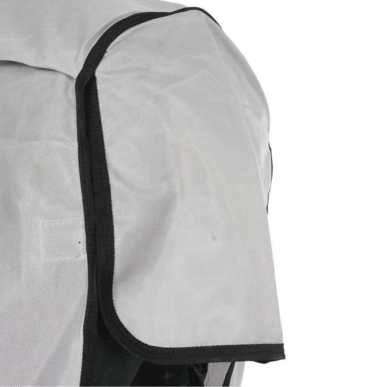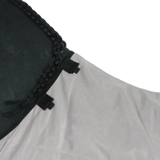 Das Außenzelt ist anatomisch geformt, um auch nach dem Rollen an der richtigen Stelle zu bleiben. Geschlossen wird das Bruststück durch einen starken Klettverschluss und den speziellen Dreipunktverschluss. Durch den Dreipunktverschluss lässt sich die Decke noch besser anpassen für eine noch bessere Passform. Zum Schutz des Bauches gibt es einen speziellen Bauchlappen. Diese Klappe wird durch einen Klettverschluss und drei gerade Bauchgurte befestigt. Da die Klappe nahe am Pferd liegt, verhindern Sie, dass Insekten durch die Seiten in die Decke fliegen. Der Schweiflatz ist etwas länger als normal und hat innen einen Gummizug. Durch das Gummiband bleibt der Schweif Ihres Pferdes nahe an der Decke und bietet mehr Schutz. Das abnehmbare Halsteil ist mit einem dickeren und stärkeren Gewebe versehen, das ein Herunterrutschen verhindert. Da die Verstärkung auf beiden Seiten des Halses angebracht ist, übt sie keinen direkten Druck auf die Mähne aus.
