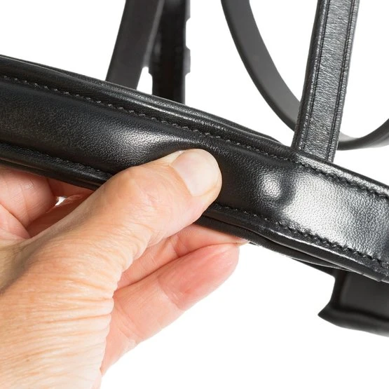 Mit Hilfe des breiter geschnittenen, anatomisch geformten Kopfstücks wird der Druck im Genick vermindert und gleichzeitig ist ausreichend Bewegungsspielraum für die Ohren gegeben. Für noch mehr Komfort sind Kopfstück und Reithalfter mit einer weichen Polsterung ausgestattet. Dieser pferdefreundliche Zaum ist mit geschwungenem, bombierten Lederstirnband oder mit Kristallstirnband erhältlich.