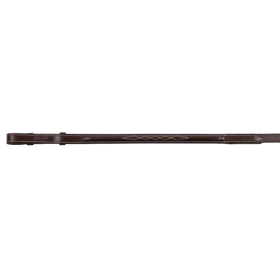 Hergestellt aus schwarzem Leder mit cremefarbener Verzierung. Der Zügel wird mit französischen Haken aus Edelstahl am Gebiss befestigt, was einen stilvollen Look ergibt.
