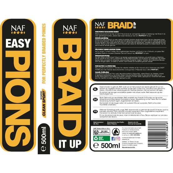 Ist ein einfach anzuwendendes Spray, mit dem Sie schneller und sauberer flechten können. Macht Mähne und Schweif nutzbarer und beugt losen Haaren vor. Ideal als Finishing Touch oder wenn Zöpfe über Nacht nicht beschädigt werden sollen. Braid it up kann leicht ausgebürstet werden.