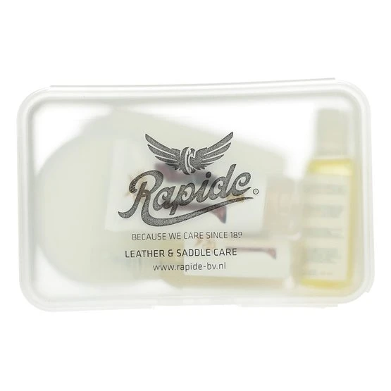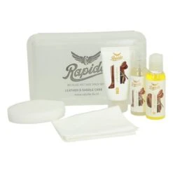Komplette Wartung Set mit drei Rapide Lederpflegemittel, ein Schwamm und Tuch. Für die Pflege von Sätteln und anderen Lederwaren.
