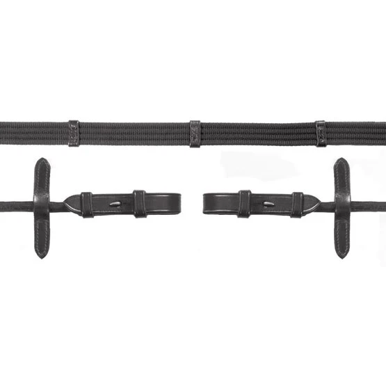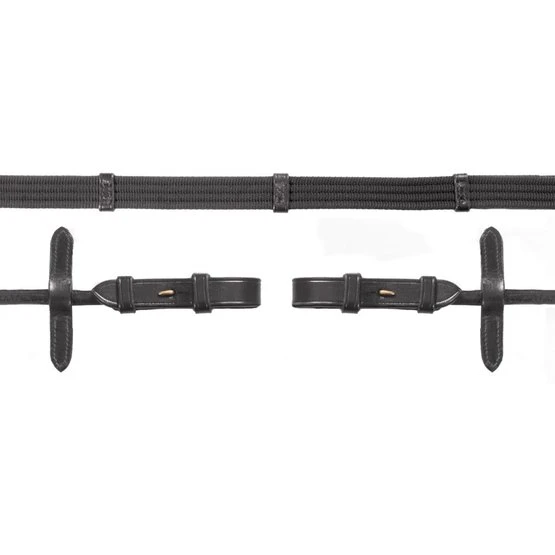 Eleganter GURTZÜGEL mit feinen, rundgenähten Lederenden und Zaumhaken. Der Zügel ist aus 19 mm breitem Gurtmaterial mit einfachen Lederstegen gefertigt und hat Martingalstopper.